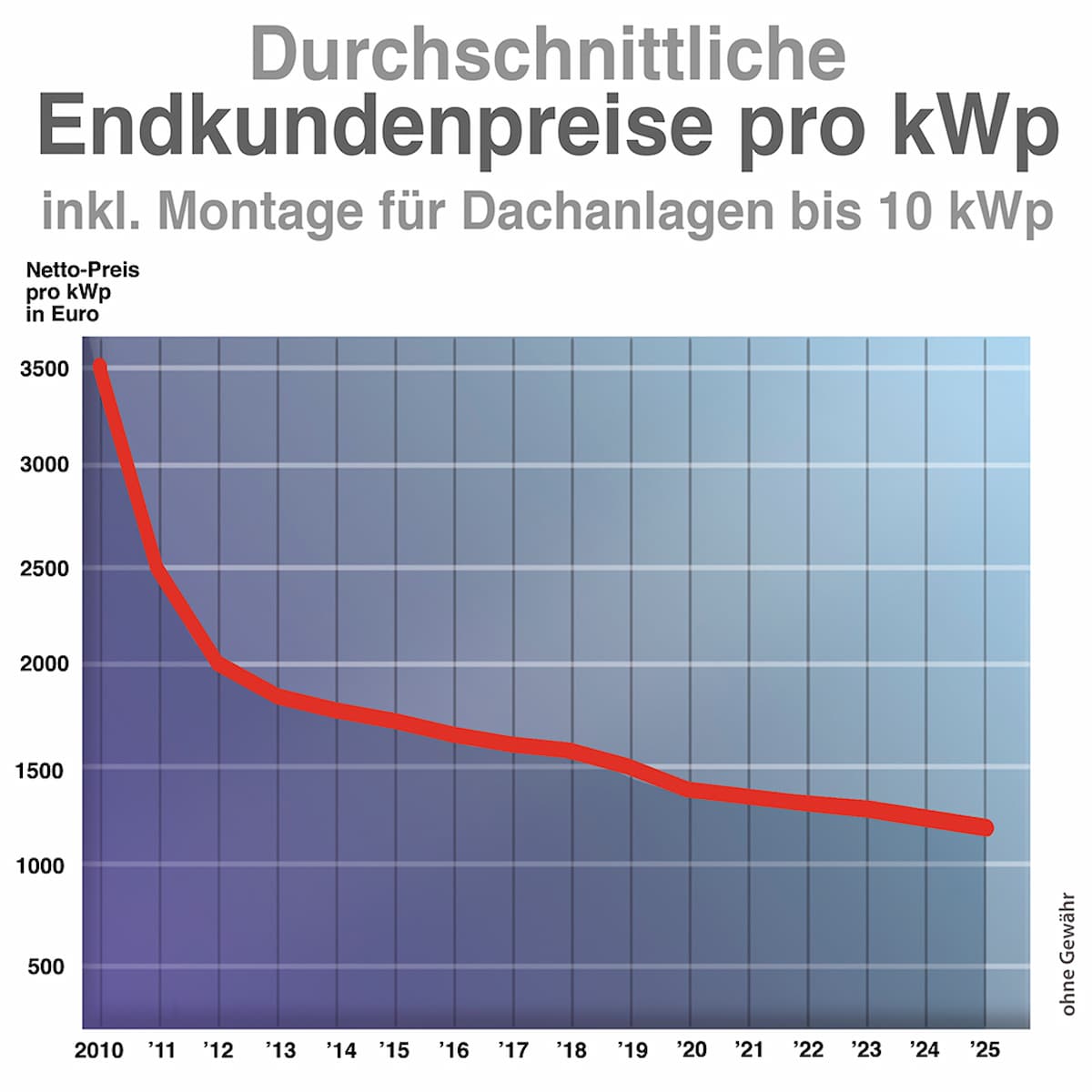 Seit 2006 sind die Preise laut Fraunhofer ISE um durchschnittlich 13% pro Jahr gesunken. Kostete eine Anlage 2012 noch etwa 2.300 Euro pro kWp, liegt der Preis 2025 bei rund 1.250 Euro pro kWp – ein Gesamtrückgang von etwa 75% in nur 15 Jahren.