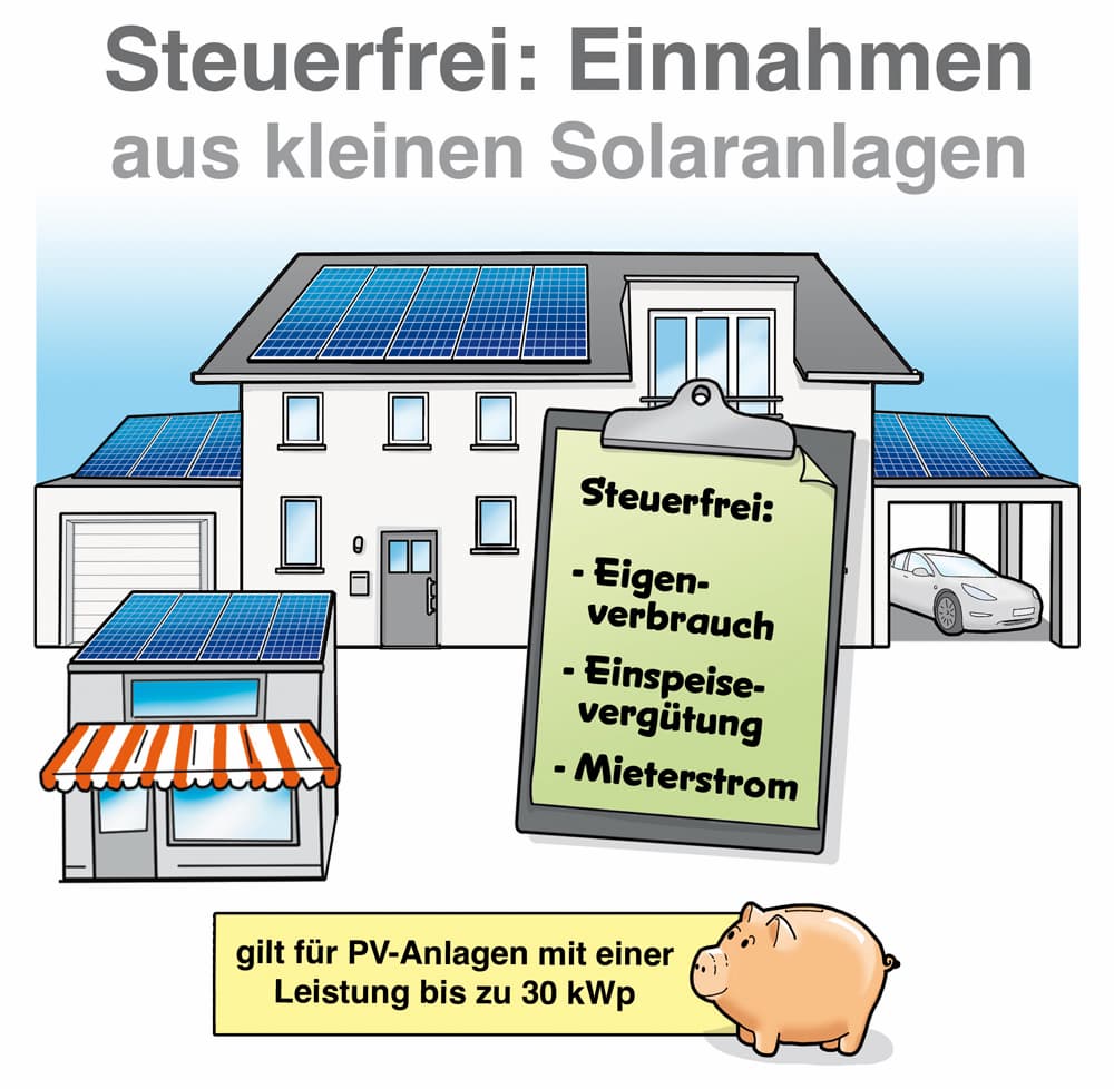 Das Jahressteuergesetz vom Dezember 2022 regelt zusätzlich: Wohnhaus-Anlagen bis 30 kWp musst du bei der Einkommensteuer nicht mehr berücksichtigen. Eine Gewinnermittlung ist nicht mehr erforderlich, und du stellst keinen Antrag auf Steuerbefreiung.